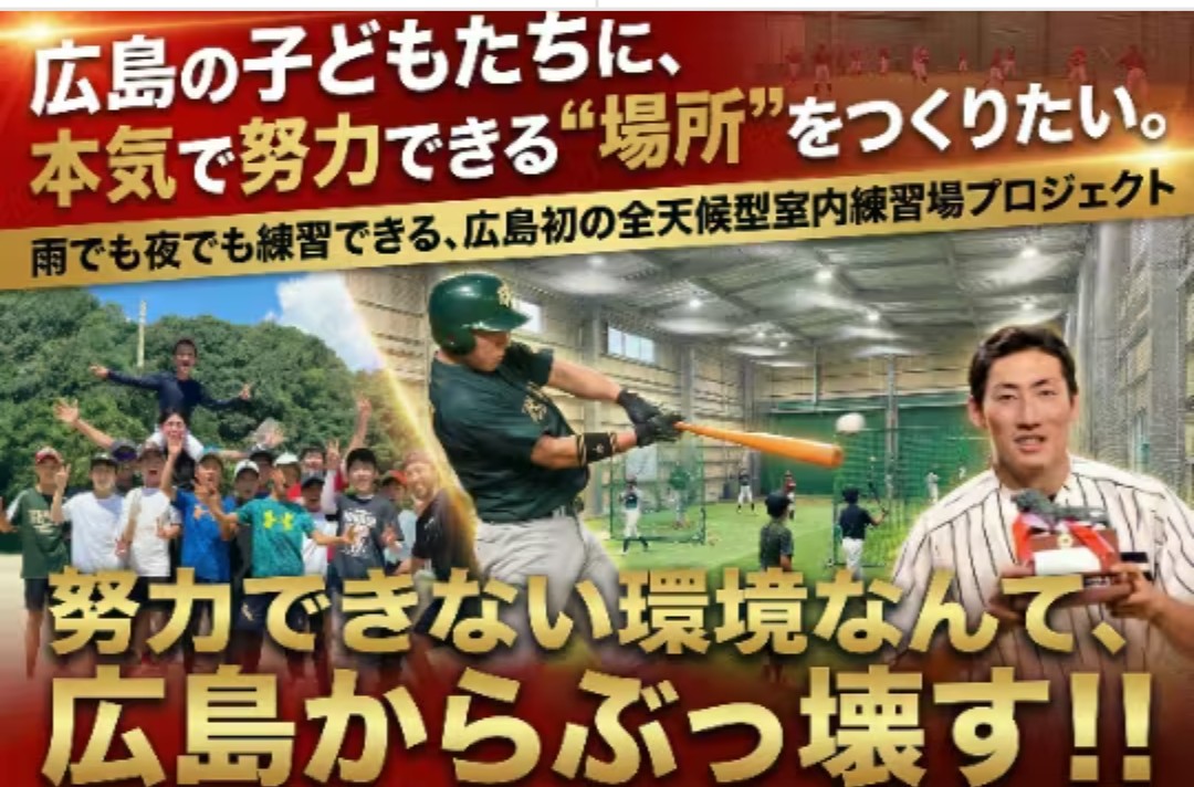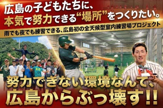 元社会人野球選手・近森雄太が挑む「室内練習場」建設プロジェクト! 支援 2026.01.05広島の子どもたちに、本気で本気で努力できる場所を作りたい!気持ちに共感し、支援いたしました。 元社会人野球選手・近森雄太が挑む「室内練習場」建設プロジェクト!【広島からメジャーリーガーへ】夢を諦めない子どもたちのために。